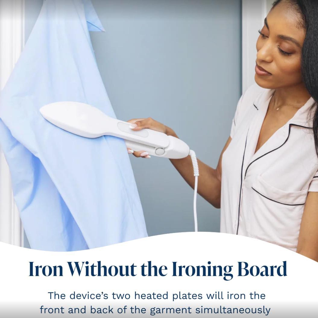 Irons both sides of fabric simultaneously, cutting ironing time in half for efficient wrinkle removal.